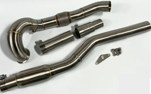 The Catless Exhaust Downpipe is engineered to replace the factory catalytic converter (cat) with a straight-through design, eliminating restrictions in the exhaust system. This allows for smoother exhaust gas flow from the turbocharger to the exhaust system, reducing backpressure and improving overall engine performance.